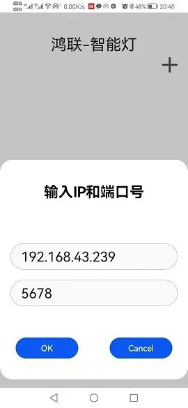 ②手机连接相同 WiFi,查看开发板 IP 为 192.168.43.239,打开手机端的智能灯 APP,点击右上角的加号按钮,输入开发板的 IP 192.168.43.239 和端口 5678,点击 OK 后会自动连接开发板。