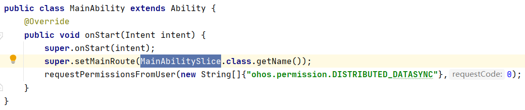 在 entry>src>main>Java>MainAbility 文件里添加敏感权限(非敏感权限在该文件里可加可不加),在 onStart 函数里添加以下代码: