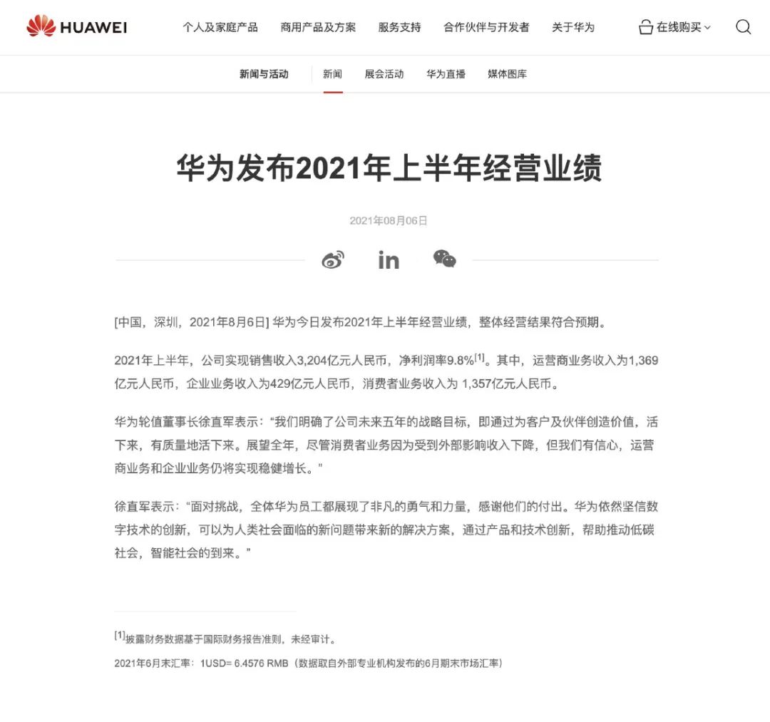 8 月 6 日,华为发布了 2021 年上半年经营业绩,并表示整体经营结果符合预期。