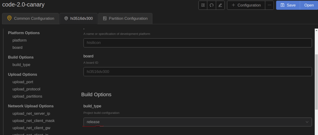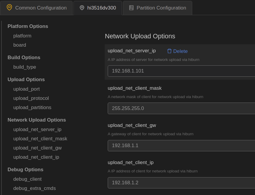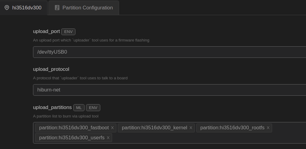 ③在“hi3516dv300”选项卡下,设置烧录选项 upload_port、upload_partitions 和 upload_protocol。注意设置之前需完成硬件连接并通电。