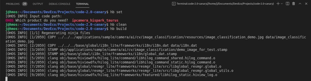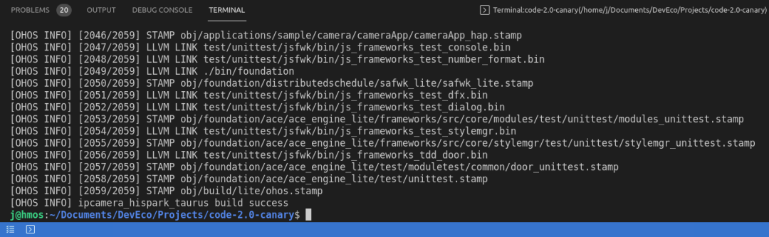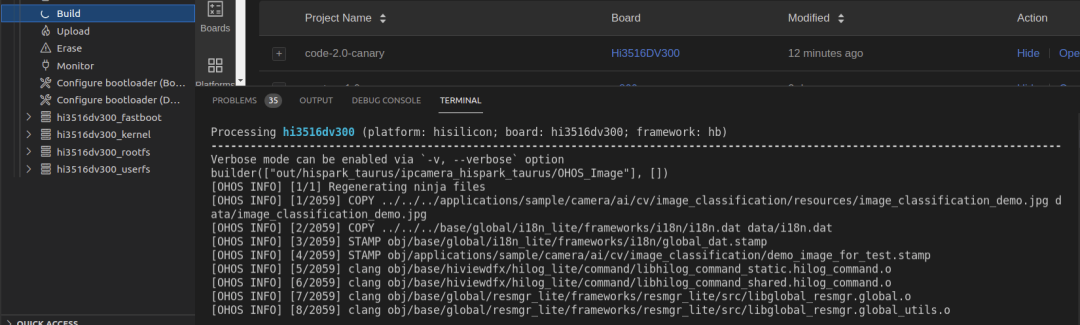 ⑥打开 DevEco Device Tool 界面,在“PROJECT TASKS”中,点击 code-2.0-canary 工程 Hi3516DV300 开发板下的 Build 按钮,执行编译。