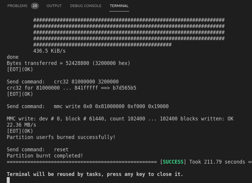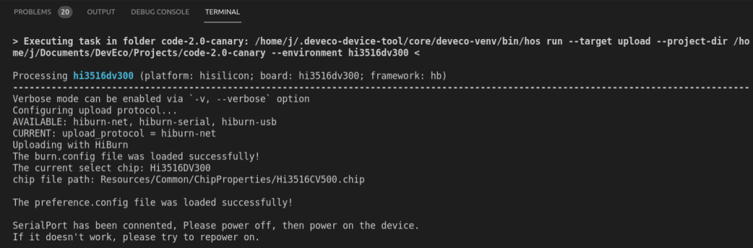 ⑥打开工程文件,点击图标,打开 DevEco Device Tool 界面,在 PROJECT TASKS 中,点击 code-2.0-canary 下 hi3516dv300 的 Upload 按钮,启动烧录。
