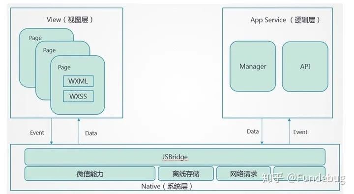Service 逻辑层,View 层用来渲染页面结构,AppService 层用来逻辑处理、数据请求、接口调用,它们在两个线程里运行。