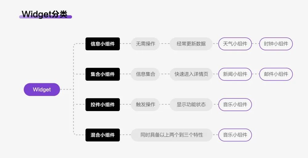 Widget 按照用户使用场景的不同,可以分为:信息小组件、集合小组件、控件小组件及混合小组件。
