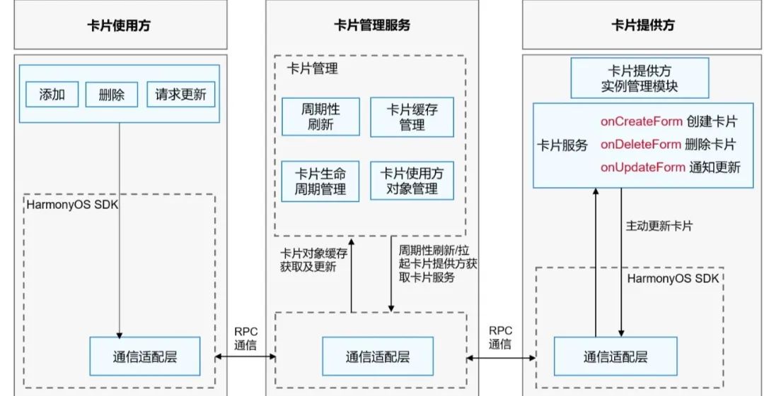 通信适配层:由 HarmonyOS SDK 提供,负责与卡片管理服务通信,用于将卡片的更新数据主动推送到卡片管理服务。