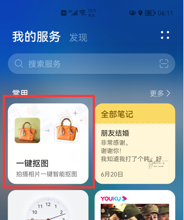 以后,我们不需要再搜索,只需进入到“我的服务”,点击这里的“一键抠图”卡片,就可以打开它进行抠图了。
