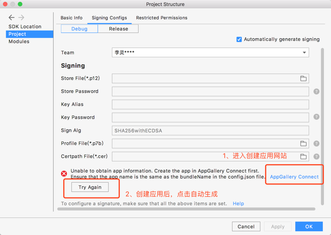配置签名需要签名文件,而签名文件必须经过华为官网才能生成。