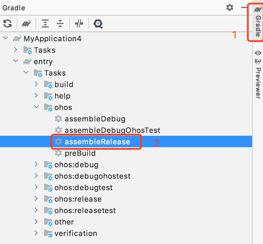 打开 DevEco Studio 右上方的 gradle 面板,选择 assembleRelease,双击运行即可。