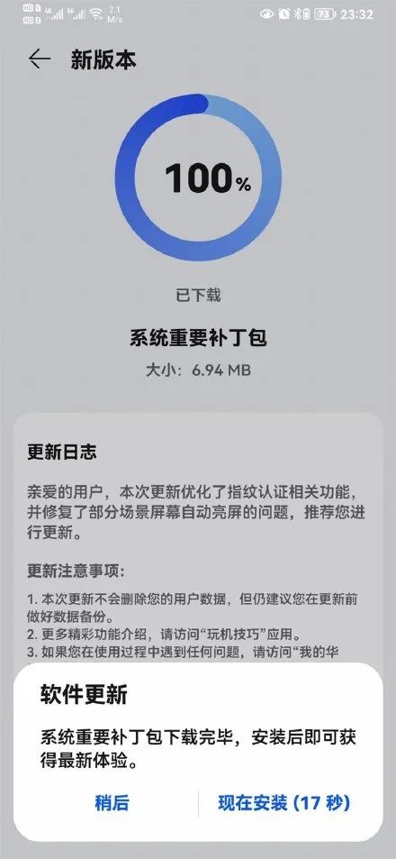 从更新日志来看,本次更新解决了两个问题,一个是优化了指纹认证相关功能,另一个是修复了部分场景屏幕自动亮屏的问题。