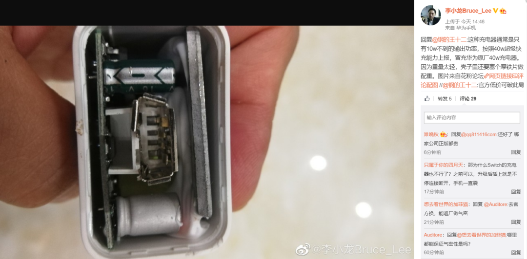 他补充道:这种充电器通常是只有 10W 不到的输出功率,按照 40W 超级快充能力上报,冒充华为原厂 40W 充电器。因为重量太轻,壳子里还要塞个厚铁片做配重。