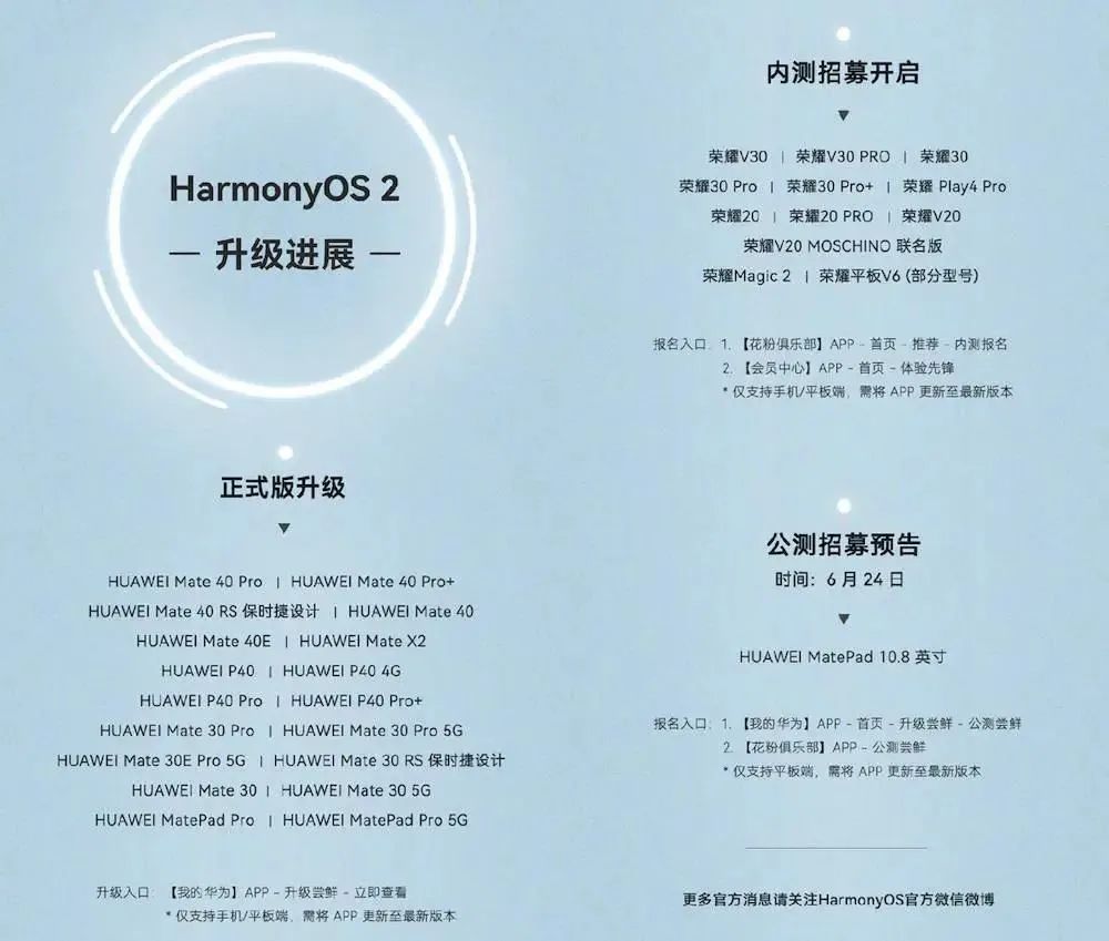 同时,开启内测招募的有 12 款机型,主要是荣耀手机及平板,包括荣耀 V30、荣耀 30、荣耀 20 系列及荣耀 Magic 2、荣耀平板 V6 等。6 月 24 日开始公测招募的是 MatePad 10.8 寸的平板电脑。