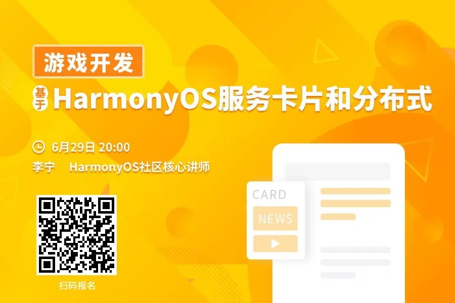 下周二(6 月 29 日)20:00,HarmonyOS 社区核心讲师——李宁老师,将会为大家带来主题为《游戏开发-基于HarmonyOS服务卡片和分布式 》的公开课。