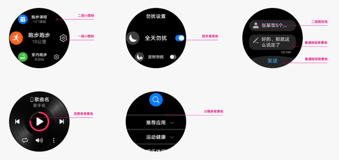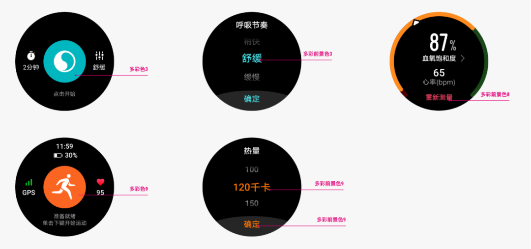 定义了前景色和背景色,色彩主要使用场景是运动健康的数据颜色和 App 颜色。