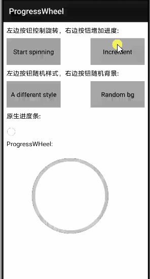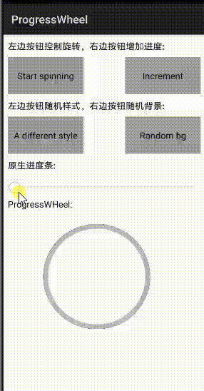 其中(1)、(2)两种场景较为简单,均为按钮触发,调用 ProgressWheel 类的开始旋转、进度增加方法即可,在 Library 解析部分会详解解释。此处重点介绍(3)、(4)、(5)三种场景。