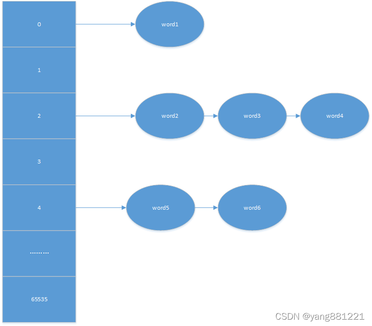具体结构如下,可以每个单词用一个32位整数标识,称为wordid,所有单词保存在hash结构里。hash桶格式可以配置,这里可以定位65536(数量小了冲突多,数量大了浪费空间)。这个每个单词位置可以使用wordid%65536,hash值重复的保存在冲突链表里。