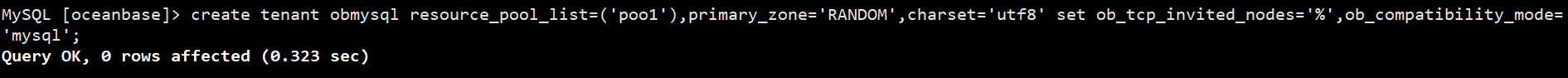 create tenant obmysql resource_pool_list=('poo1'),primary_zone='RANDOM',charset='utf8' set ob_tcp_invited_nodes='%',ob_compatibility_mode='mysql';