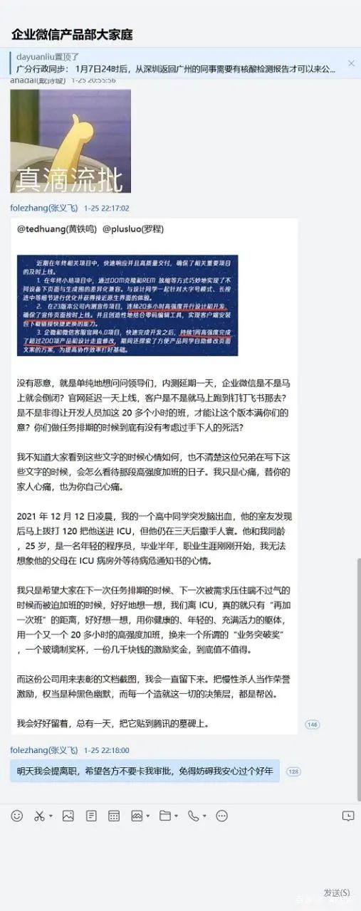 1月26日下午消息,此前,多个社交媒体大V爆料:25日深夜,腾讯企业微信的一名应届生员工在部门内部大群中,因“赶版本”导致的高强度加班问题,发消息怒怼管理层。该员工质疑管理者在进行任务排期时,只顾进度而忽略开发人员连续加班,影响健康的问题。