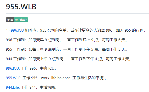 955.WLB的热门项目,项目上列举了一些 955 或者接近 955 工作状态的公司。WLB 即