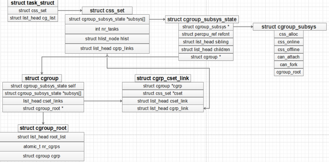 cgroups 主要的数据结构以及之间的关系如下图所示:
