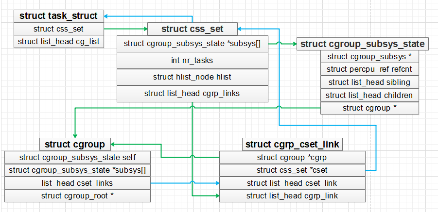 struct cgroup 和 struct css_set 对应获取的路径入下图所示,绿色箭头为 css_set->cgroup,蓝色箭头为 cgroup->css_set