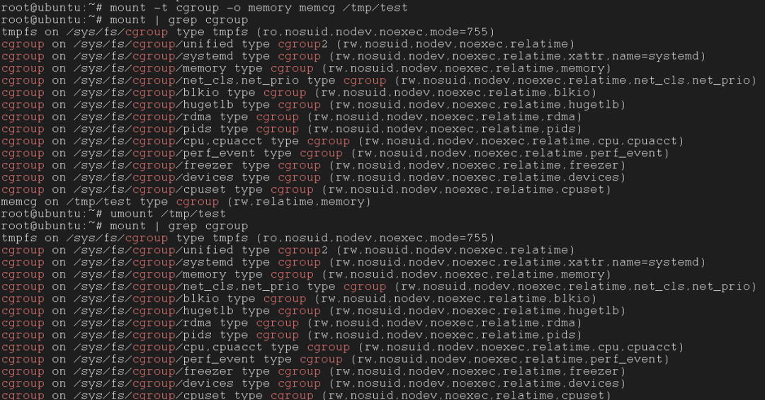 mount -t cgroup -o memory [name] [dir]umount [dir]