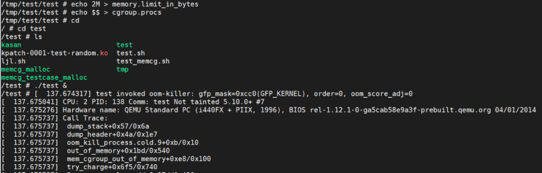 /* 对memcg进行内存上限的限制 */echo xxx > /[memcg_dir]/memory.limit_in_bytescat /[memcg_dir]/memory_limit_in_bytes/* 迁移一个进程到指定的memcg */echo [pid] > /[memcg_dir]/cgroup.procs
