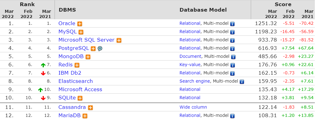MySQL得分1198.23,虽居第二位。但众所周知,排在第12位的MariaDB,实际上可以算作MySQL的分枝,而且两者分家也才没几年,MySQL粉们都把MariaDB算作MySQL。