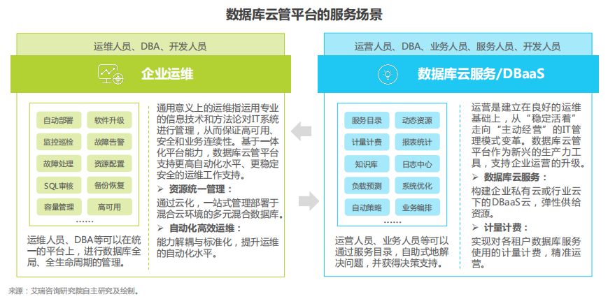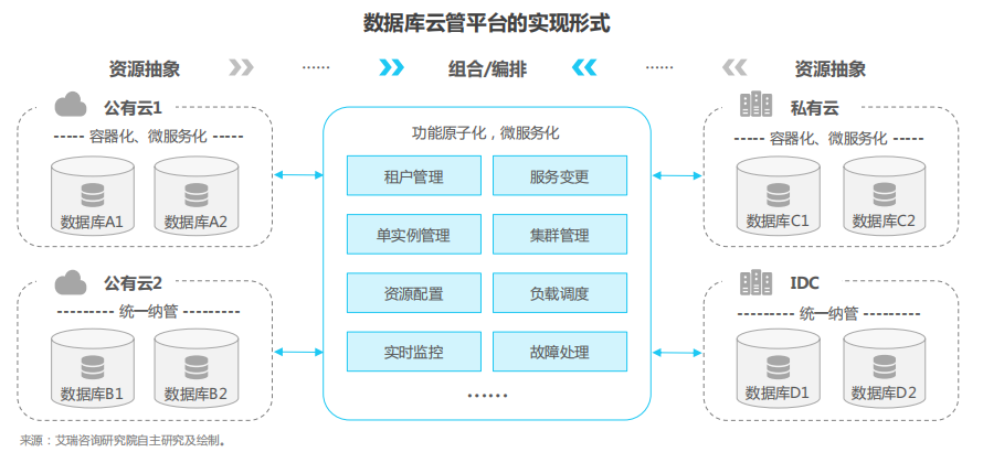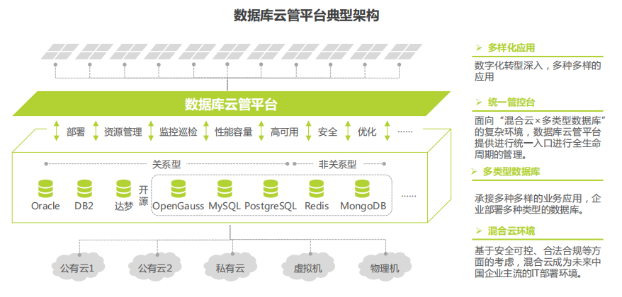 1)多类数据库统一管理: 多种类型数据库的统一管理, 从离散走向集约,提升资源利用率和弹性,降低IT运营成本;
