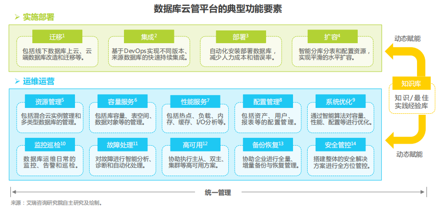 面向多元混合数据库环境带来的挑战,数据库云管平台可以为企业提供一站式的全局管理、高效运维和智能运营服务,其范畴覆盖数据库从实施部署到运维运营的全生命周期。具体来看,平台的核心功能要素包括平滑迁移、自动化部署、持续 集成、弹性扩容等实施服务,资源、性能、容量、配置等管理和优化服务,日常监控巡检、故障分析与智能处理服务,以及高可用、备份恢复等稳定性和安全方面的服务。