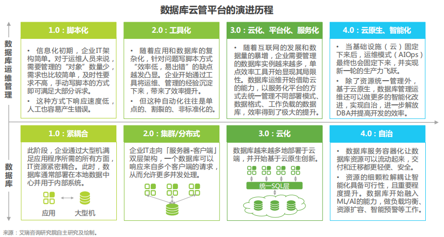 随着数据库技术的发展,数据库运维管理也历经多个阶段的发展,从手动写脚本(1.0)、使用单点工具(2.0),走向构建云化服务化的平台(3.0)。未来将基于云原生环境,向智能化自治(4.0)进一步演进。