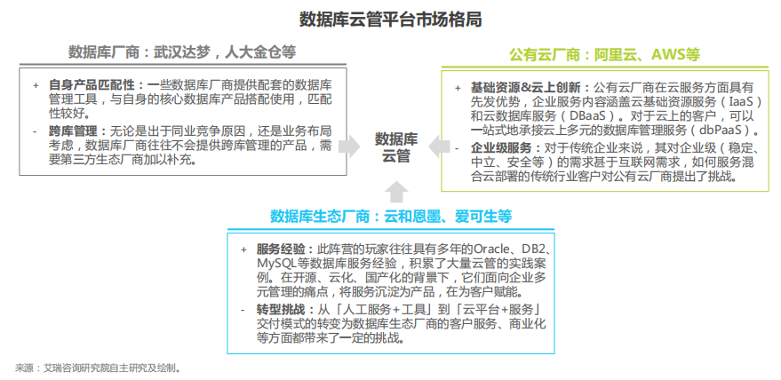 当前提供数据库云管平台产品的厂商分为三类:一类是数据库生态厂商,他们具备多年的企业数据库服务经验和实践案例积累,具备服务产品化的先发优势;一类是公有云厂商,顺接IaaS和DBaaS服务,进而为企业提供DBPaaS服务;一类是数据库厂商,在提供核心数据库产品的同时配套管理工具。