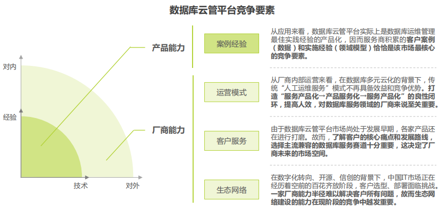 数据库云管平台厂商间的竞争要素体现在产品层面的产品能力,厂商层面的运营模式、客户服务和生态网络上。正如前面提到的,数据库云管平台的本质是数据库管理经验的代码化,因此,由数据库管理服务经验转化而来的产品能力就是厂商的核心差异点。现阶段,从产业分工、厂商发展历程、客户需求和产品能力综合来看, 数据库生态厂商具有先发优势。