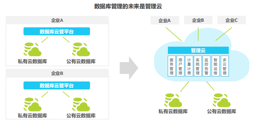 数据库云管平台作为孵化于多元混合数据库时代背景下的新兴数据库管理工具,不仅可以更高效地支持以“稳定安全”为核心的运维工作,保障业务的连续性,还可以更广泛地支持“主动优化”模式的运营工作,近一步为业务赋能。通过数据库云管平台,企业一方面可以通过标准流程自动化实现准确和高效运维,另一方面可以构建企业私有云或行业云下的DBaaS云,实现运营模式升级。