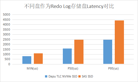 统计DapuStor NVMe SSD和SEAGATE SAS HDD分别作为Redo Log存储介质时,TPC-C测试模型中40vuser 测试时NewOrder 事务的时延。MIN为最小响应时间,P50为50%事务的最大响应时间,P95为95%事务的最大响应时间。