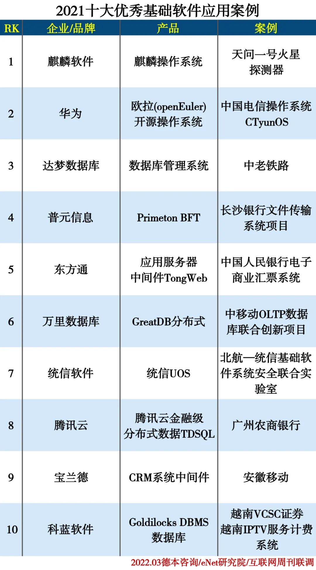 2021年5月15日7时18分,使用我国自主研发的麒麟操作系统的“天问一号”火星探测器成功着陆火星,麒麟已经在中国空间站、北斗等领域得到广泛应用,为国家重大项目贡献了“中国大脑”。国产操作系统的崛起是国产基础软件替代化的重要一步,从研发到适用,从适用到普及,在风雨中攻坚克难,斗志昂扬,最终走出了“大国重器”的道路,麒麟翱翔,逐梦前行。2、华为:欧拉(openEuler)开源操作系统,中国电信操作系统CTyunOS中国电信推出基于openEuler的操作系统CTyunOS,是一款面向云计算领域的专业服务器操作系统。中国电信在全行业中首个全业务选择欧拉技术路线,同时,也是首个推出基于欧拉的x86和ARM自主研发双版本的运营商。当前CTyunOS已实现规模商用,为云网边端提供统一的操作系统服务。连接中国昆明和老挝万象、联通中老民心的标杆项目,被习总书记评价为“是两国互利合作的旗舰项目,是高质量共建‘一带一路’的标志性工程”。以达梦数据库管理系统DM8、达梦数据守护集群DMDataWatch、达梦数据实时同步软件DMHS等产品为代表的达梦方案,为中老铁路信息化建设的“中枢神经”——中老高铁信号调度系统提供重要支撑,全力保障中老铁路运行网络的中心调度集中指挥和车站分散自律控制,全面提升中老高铁运行效率和确保运行安全。4、普元信息:Primeton BFT,长沙银行文件传输系统项目Primeton BFT是普元覆盖信创关键领域提供替换方案的全栈式信创中间件产品之一,是一款基于Java开发的、高可靠、易管控的分布式大文件传输平台。BFT针对信创环境进行了深度优化,整体性能提升一倍,能够帮助客户无缝替换国外同类产品,并基于全栈信创环境适配完成平滑迁移,满足业务高并发性能的需要,安全合规,传输可控、可扩展,确保系统可靠运行。长沙银行文件传输系统项目将使用普元大文件传输平台Primeton BFT构建高可靠、易管控的银行文件传输系统,满足银行业务发展与上级机构监管要求中的文件传输刚性需求。5、东方通:应用服务器中间件TongWeb,中国人民银行电子商业汇票系统电子商业汇票系统功能主要为身份认证管理、数据信息交换等;在市场参与成员上,除了商业银行,还有财务公司、信托公司等非银行金融机构。在中国人民银行电子商业汇票系统中,商业银行和财务公司的前置系统是电子商业汇票系统的末端节点,采用了TongWeb的J2EE应用服务器作为前置系统的运行平台,完成接入单位内部系统和人民银行系统之间的数据收发、记录、转换和处理等过程。电子商业汇票系统的建成,降低票据业务风险和成本,促进全国统一的票据市场的形成,丰富支付结算工具、便利中小企业融资。6、万里数据库:GreatDB分布式,中移动OLTP数据库联合创新项目2020年7月,万里数据库中标该项目分布式包,助力中移动实现OLTP数据库的能力内化,积极参与数据库国产化进程。OLTP数据库是中移动IT业务支撑系统中的核心基础产品之一,在中国移动IT支撑系统中有着广泛的需求和应用场景。该项目中,分布式数据库GreatDB立足核心技术自主创新,推动适用于中国移动核心IT系统的数据库产品自主研发、落地应用,先后服务于中国移动磐基PaaS及中国移动集团和下辖省市业务系统中的数据库国产化实践,助力中国移动集团实现整体降本增效。7、统信软件:统信UOS,北航—统信基础软件系统安全联合实验室北航—统信基础软件系统安全联合实验室为了更好地推动自主操作系统的发展,立足未来信息产业的长远发展,同时推动开展前沿技术研究与高端创新型人才培养,统信携手北航共同打造基础软件防护体系。学院与企业的结合,优势互补的同时能够推动双方技术交流和人才培养,让国产基础软件操作系统加快发展步伐。8、腾讯:腾讯云金融级分布式数据库TDSQL,广州农商银行广州农商银行是全国区域性银行中的佼佼者,长期以服务三农、服务中小企业、服务社区、服务地方经济为使命,拥有独特的竞争优势和经营特色。2020年12月腾讯云与广州农商银行签署战略合作协议,双方将共同构建具有鲜明区域特色、开放共赢的创新金融服务生态,加速推进广州农商银行全面数字化转型进程。2021年2月搭载了腾讯云金融级分布式数据库TDSQL的全栈分布式金融云平台已在广州农商银行平稳上线投产,这是腾讯云与广州农商银行携手探索数字化转型取得的首个重要里程碑。相比原Oracle中间件,安徽移动中间件替换为宝兰德中间件之后,容器环境下其镜像文件大大减小,满足容器快速部署的轻量级要求;CRM系统发布效率将提升1倍以上,消息序列化传输效率、启停速度、TPS吞吐量等多项指标都会得到有效提升。宝兰德中间件针对企业内应用复杂灵活部署要求,提供了一个稳定、安全、高效、基于标准的管理和运行平台,支持云原生、微服务环境动态部署和快速启动, 同时帮助降低 IT 架构的复杂性,使开发人员以更低的成本、更短的时间开发部署企业级应用,从而达到降本增效。10、科蓝软件:Goldilocks DBMS数据库,越南VCSC证券和IPTV服务计费系统科蓝软件在2020年入选了《中国上市公司共建“一带一路”优秀实践案例选编》,其中,科蓝软件的Goldilocks数据库应用于越南Sirius虚拟货币交易所系统,越南VCSC证券公司核心总账系统及越南第一大运营商的IPTV服务计费系统。分布式内存数据库从技术上既符合目前分布式数据库市场