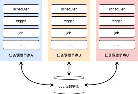 quartz架构中使用数据库锁保障多节点任务执行时的唯一性,解决了单点故障的问题。但数据库锁的集中性也产生了严重的性能问题,比如大批量任务场景下,数据库成为了业务整体调度的性能瓶颈,同时在应用侧还会造成部分资源的等待闲置,另外还做不到任务的并行分片。
