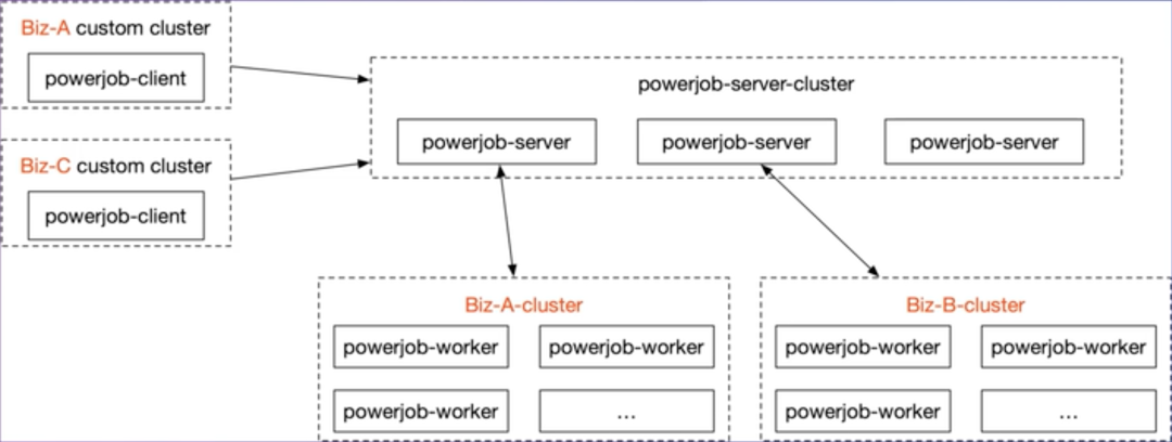powerjob-server:调度中心,统一部署,负责任务调度和管理;