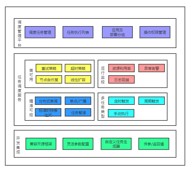 分布式架构:分布式架构趋势的全面到来,是最重要的推进因素。框架的整体设计须以分布式架构为前提,在任务节点及调度中心间的通讯、调度平台的高可用、任务节点的故障处理及恢复、任务调度可视化运维等方面,都是全新的挑战。