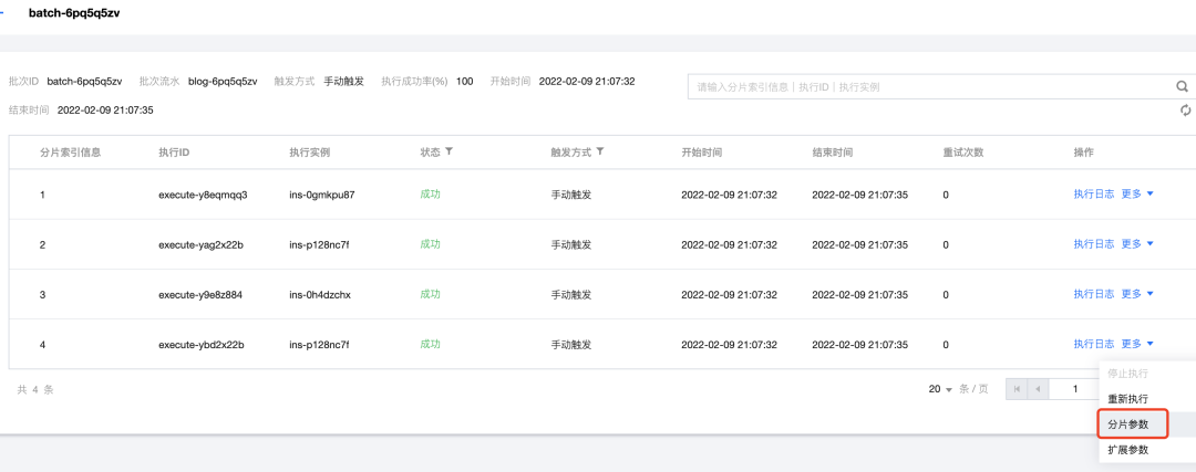 通过控制台查看实例执行情况,同时可通过分片参数按钮,查询某个实例执行批次内的分片参数。