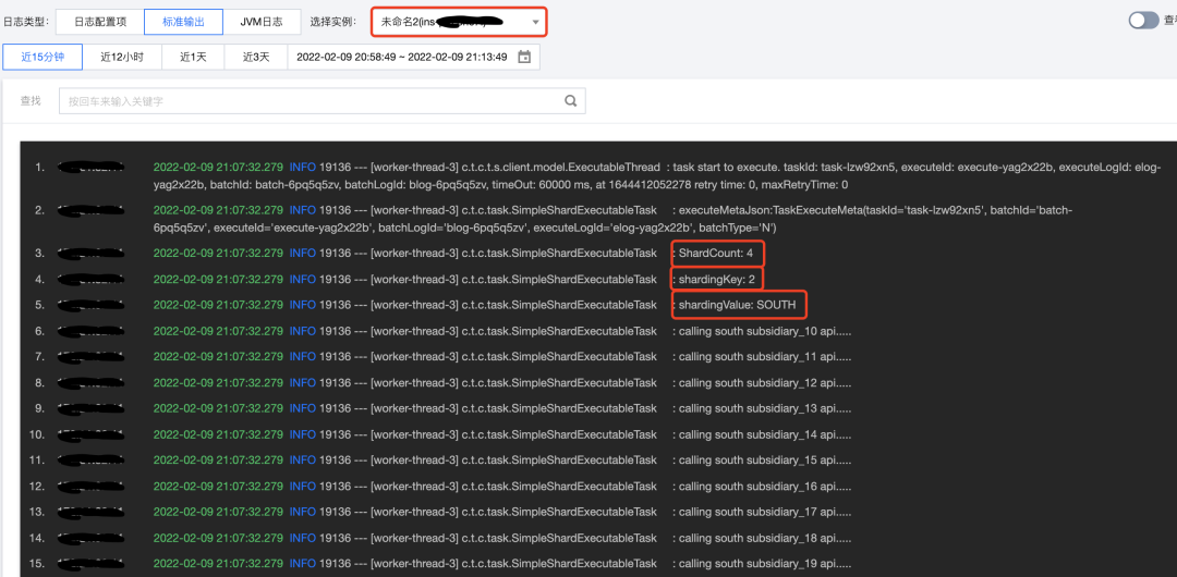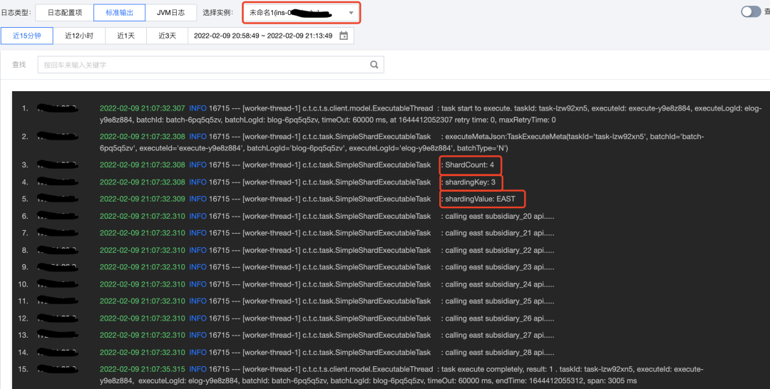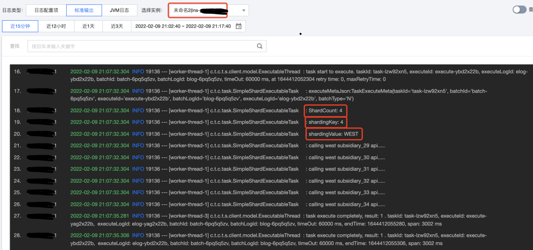 通过应用日志查看结果,可发现有1个实例运行了2个分片任务,是由于TCT对实例负载情况进行了判断,选择了相对空闲的实例。