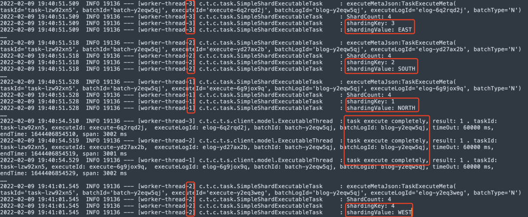 javapublic class SimpleShardExecutableTask implements ExecutableTask {private final static Logger LOG = LoggerFactory.getLogger(MethodHandles.lookup().lookupClass());@Overridepublic ProcessResult execute(ExecutableTaskData executableTaskData) {// 输出任务执行元数据TaskExecuteMeta executeMeta = executableTaskData.getTaskMeta();LOG.info("executeMetaJson:{}",executeMeta.toString());// 输出分配给本实例的分片参数ShardingArgs shardingArgs = executableTaskData.getShardingArgs();LOG.info("ShardCount: {}", shardingArgs.getShardCount());Integer shardingKey = shardingArgs.getShardKey();LOG.info("shardingKey: {}", shardingKey);String shardingValue = shardingArgs.getShardValue();LOG.info("shardingValue: {}", shardingValue);// 模拟任务执行try {this.doProcess(shardingValue);} catch (Exception e) {e.printStackTrace();}return ProcessResult.newSuccessResult();}public void doProcess(String shardingValue) throws Exception {if (shardingValue.equals(CompanyMap.NORTH.area)){Arrays.stream(CompanyMap.NORTH.companyIds).forEach(companyId->LOG.info("calling north subsidiary_{} api.....",companyId));} else if(shardingValue.equals(CompanyMap.SOUTH.area)){Arrays.stream(CompanyMap.SOUTH.companyIds).forEach(companyId->LOG.info("calling south subsidiary_{} api.....",companyId));} else if(shardingValue.equals(CompanyMap.EAST.area)){Arrays.stream(CompanyMap.EAST.companyIds).forEach(companyId->LOG.info("calling east subsidiary_{} api.....",companyId));} else if(shardingValue.equals(CompanyMap.WEST.area)){Arrays.stream(CompanyMap.WEST.companyIds).forEach(companyId->LOG.info("calling west subsidiary_{} api.....",companyId));} else {throw new Exception("input shardingValue error!");}ThreadUtils.waitMs(3000L);}enum CompanyMap{NORTH("NORTH", new int[]{1, 2, 3, 4, 5, 6, 7, 8, 9}),SOUTH("SOUTH",new int[]{10,11,12,13,14,15,16,17,18,19}),EAST("EAST",new int[]{20,21,22,23,24,25,26,27,28}),WEST("WEST",new int[]{29,30,31,32,33,34});private String area;private int[] companyIds;CompanyMap(String key,int[] values){this.area = key;this.companyIds = values;}public String getArea() { return area; }public void setArea(String area) { this.area = area; }public int[] getCompanyIds() { return companyIds; }public void setCompanyIds(int[] companyIds) { this.companyIds = companyIds; }}}