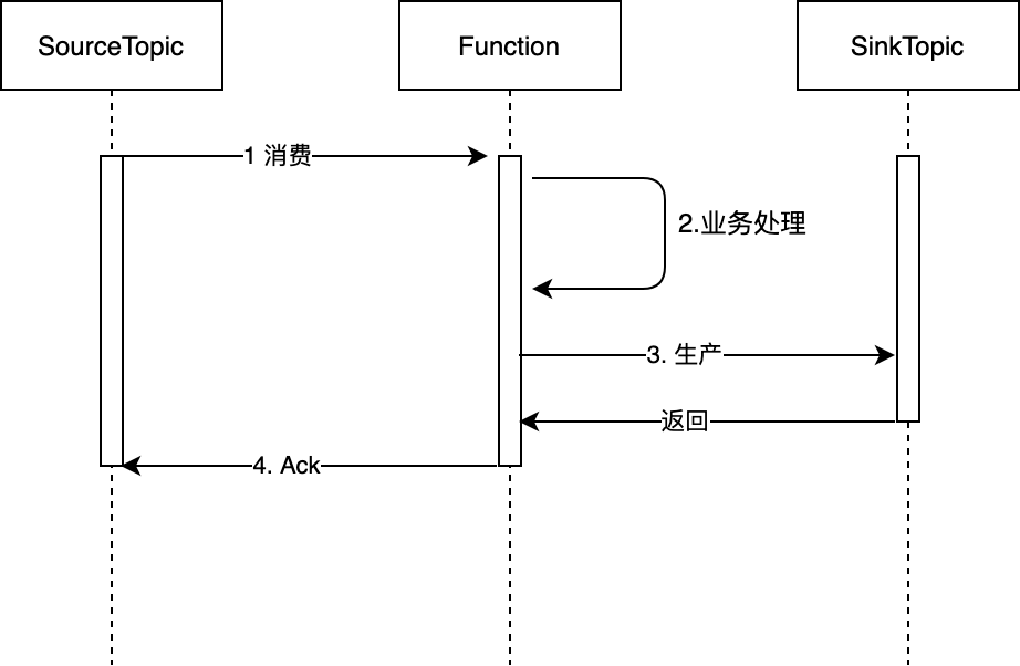 如果没有开启事务,Function会先确认消息,再把数据写入SinkTopic(先执行Step-4 再执行Step-3),此时如果写入SinkTopic失败,而SourceTopic的消息又已经被确认,则会造成数据丢失,最终的计算结果也不准确。
