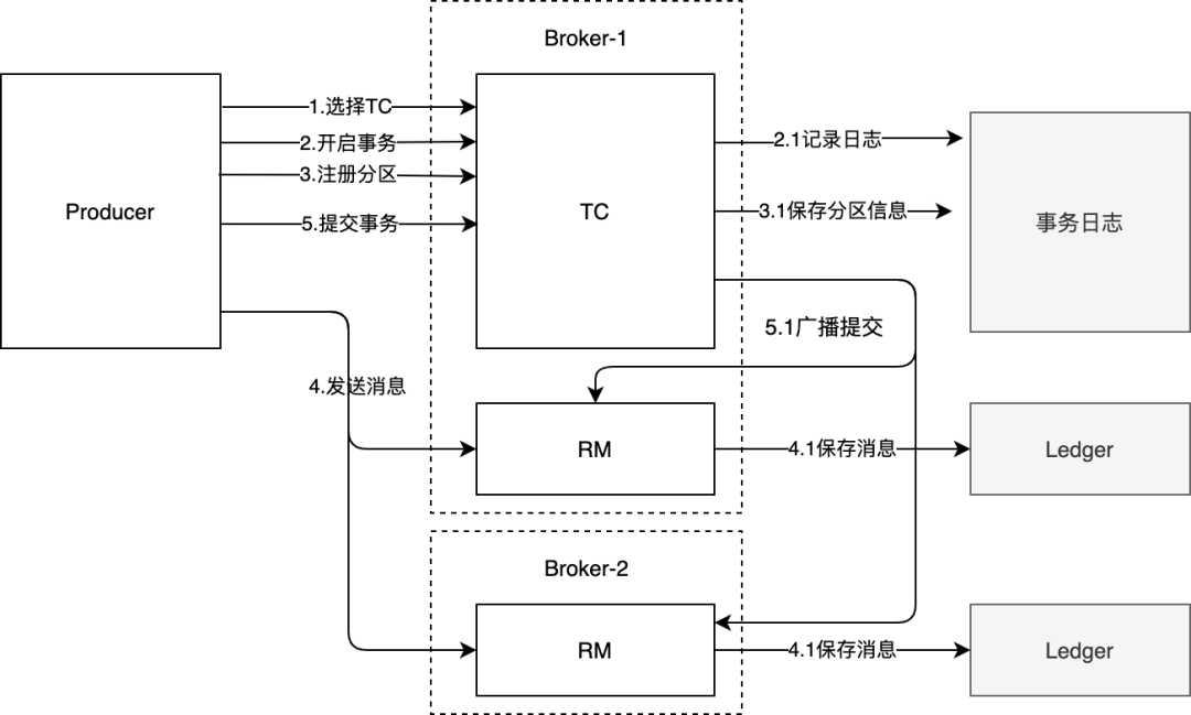 所有的事务提交、回滚,由于Client端告知TC,或者由于超时TC自动感知。TC的日志中保存了Producer的消息要发往哪些Partition,也保存了Consumer会Ack哪些Partition。RM分散在每个Broker上,记录了整个事务中发送的消息和要确认的消息。当事务结束时,TC则以TCID为key,找到所有的元数据,通过元数据得知需要通知哪些Broker上的RM,最后发起广播,通知这些Broker上的RM,事务需要提交/回滚。