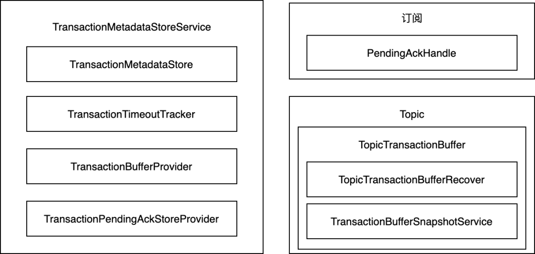 RM:每个节点的资源管理者。管理每个分支事务的资源,每一个 RM 都会作为一个分支事务注册在 TC。在Pulsar中定义了一个TopicTransactionBuffer和PendingAckHandle来分别管理生产、消费的资源。