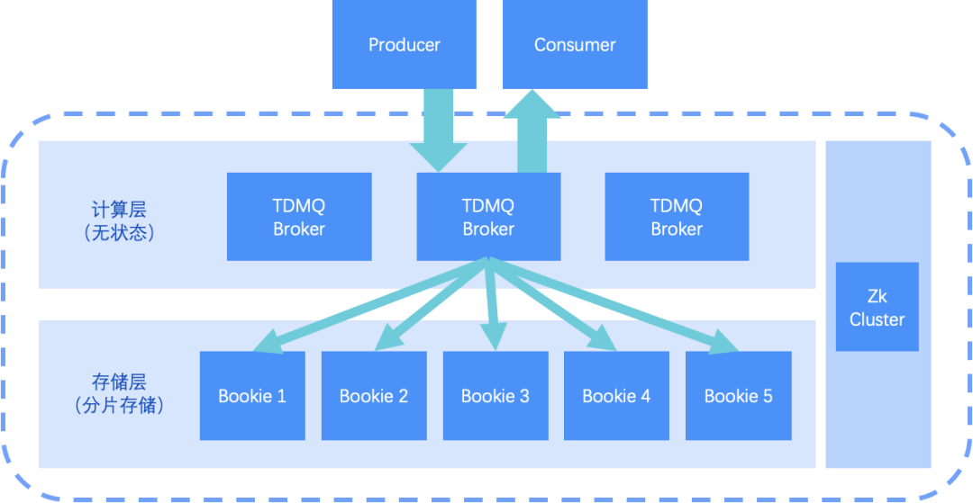 TDMQ Pulsar 版继承了开源 Pulsar 计算与存储架构分离的设计,Broker 节点无状态,能够灵活进行横向扩展。
