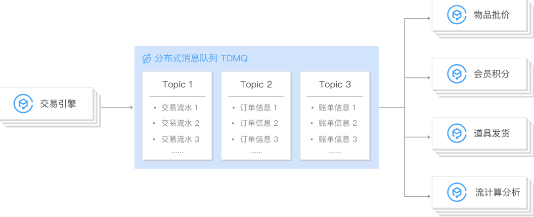 交易引擎作为腾讯计费最核心的系统,每笔交易订单数据需要被几十个下游业务系统关注,包括物品批价、道具发货、积分、流计算分析等,多个系统对消息的处理逻辑不一致,单个系统不可能去适配每一个关联业务。消息队列 TDMQ Pulsar 版可实现高效的异步通信和应用解耦,确保主站业务的连续性。