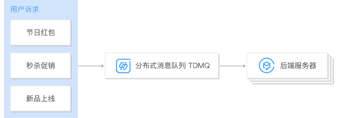 企业不定时举办的一些营销活动,如新品发布上线,节日抢红包等,往往都会带来临时性的流量洪峰,这对后端的各个应用系统考验是十分巨大的,如果直接采用扩容方式应对又会带来一定的资源浪费。TDMQ Pulsar 版此时便可以承担一个缓冲器的角色,将上游突增的请求集中收集,下游可以根据自己的实际处理能力来消费请求消息。