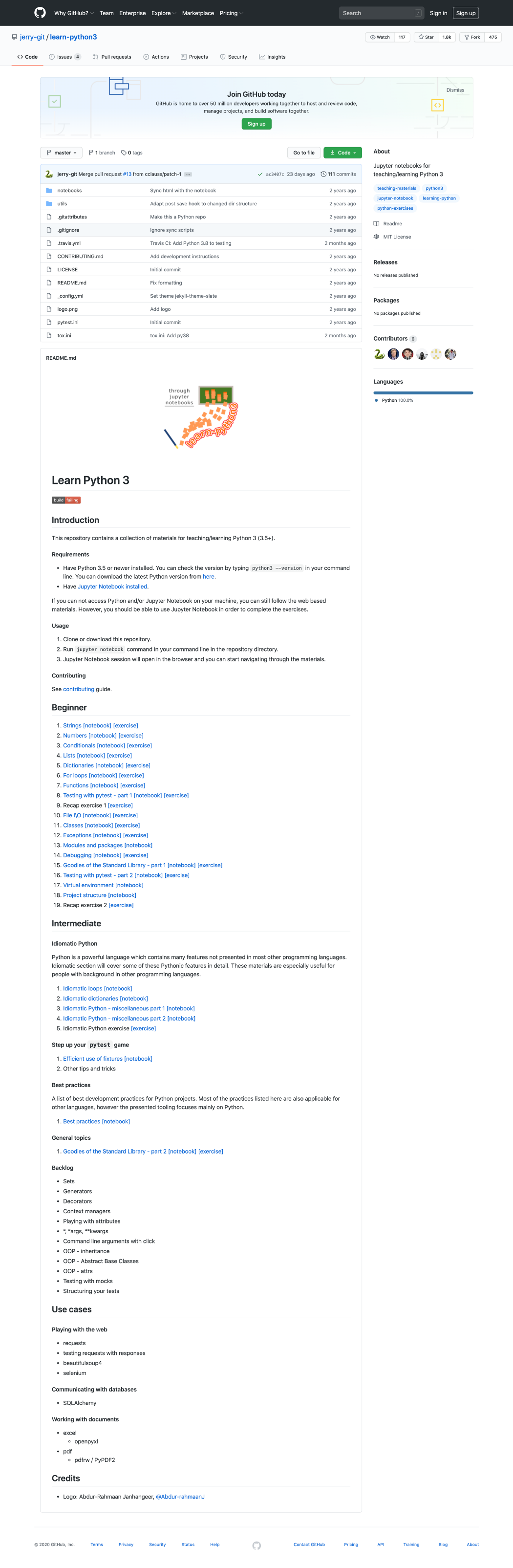 这个存储库一共有19本Jupyter笔记本。它涵盖了字符串和条件之类的基础知识,然后讨论了面向对象编程,以及如何处理异常和一些Python标准库的特性等。每一个主题都有一个“notebook”链接,它会向你介绍该主题和一些示例代码,当你完成这些内容之后,还有一个练习链接,点击后你就可以做一些测试题。