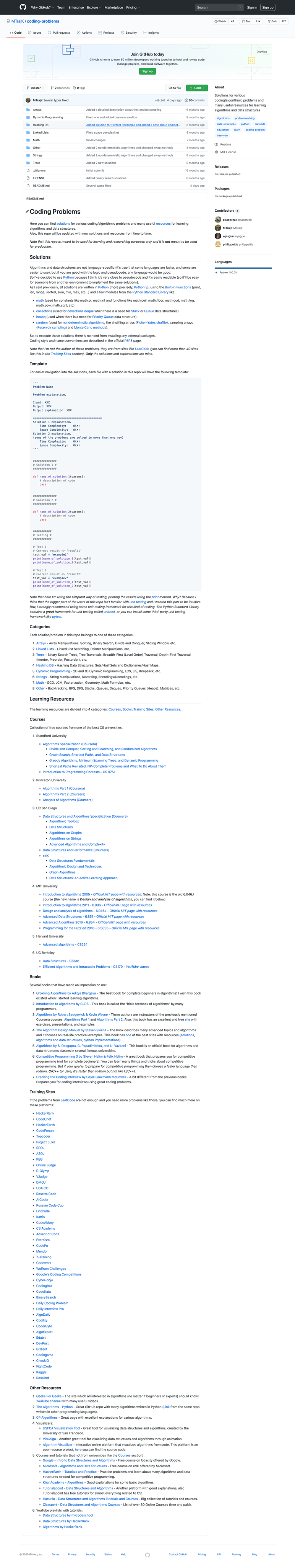 除了包含算法问题和解决方案的Python文件之外,他还提供了一个全面的其他资源列表供用户使用。其中包括许多在线课程,推荐的书籍,以及关于编程问题的热门网站的链接。