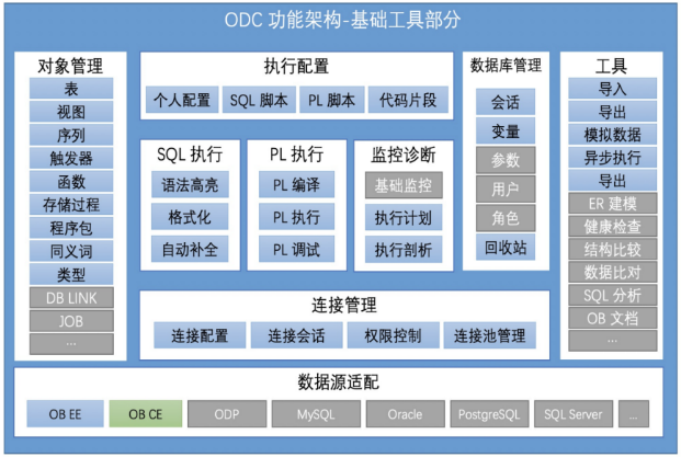 OceanBase 社区版 ODC(OceanBase Developer Center)的整体架构由三部分能力组成,包括基础能力、核心能力和高阶能力。下图为当前版本的架构图: